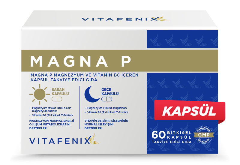 Magna P Magnezyum Takviyesi sabah ve akşam için ayrı kapsüllerde magnezyumun bisglisinat, sitrat, malat ve taurat formlarını ve B6 vitaminini içermektedir.
